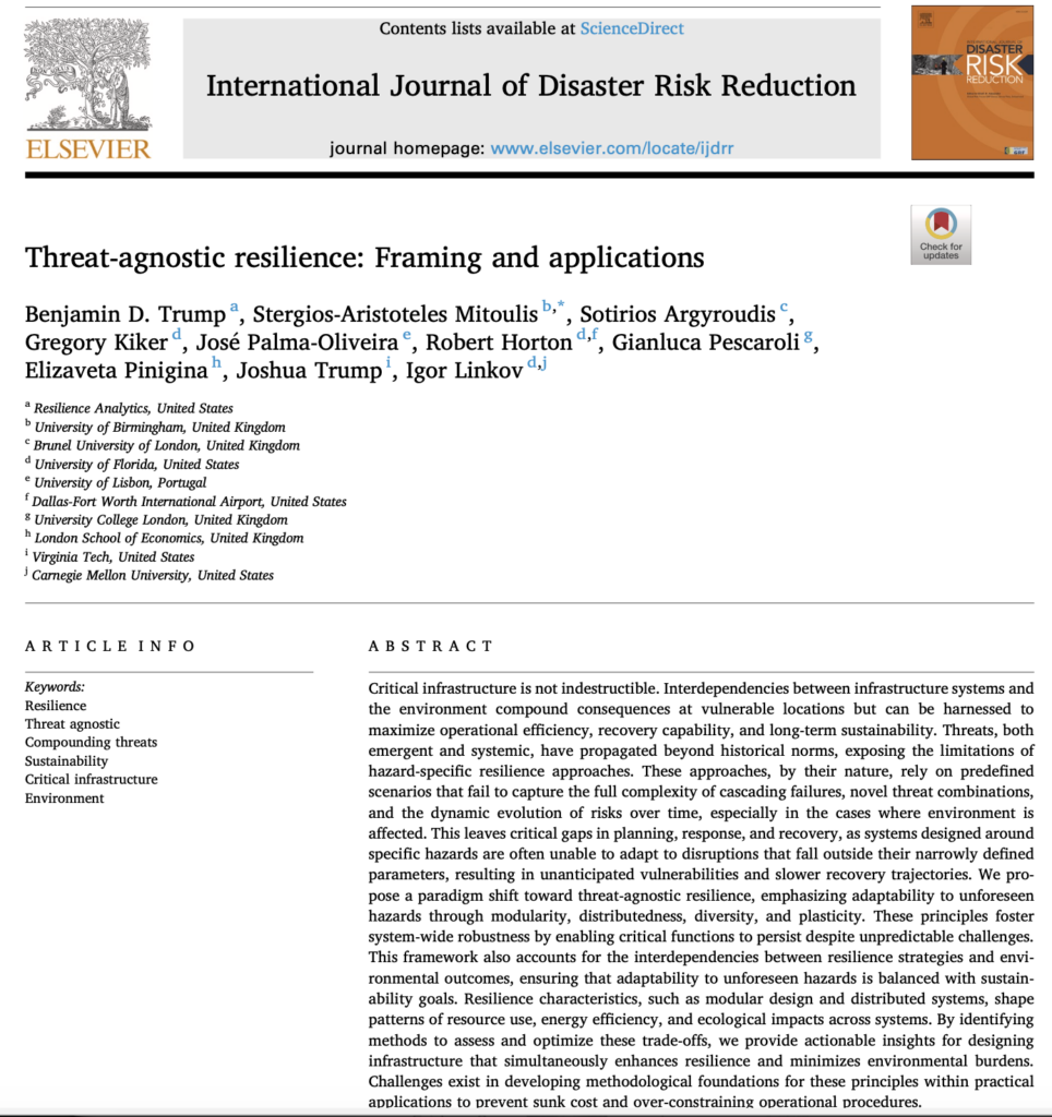 Trump, B.D., et al. (2025). “Threat‑agnostic resilience: Framing and applications.” Sustainable Cities and Society. Proposes a threat‑agnostic framing of resilience, emphasizing adaptability to unforeseen hazards via modularity, distributedness, and diversity in systems.[1]