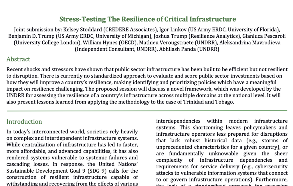 Skýrsla tengd UN/OECD sem vísar til Linkov & Trump (2023). “Stress‑Testing the Resilience of Critical Infrastructures…” Policy‑oriented piece applying a resilience‑matrix/stress‑testing framing to critical infrastructures exposed to multi‑hazard threats.[4]